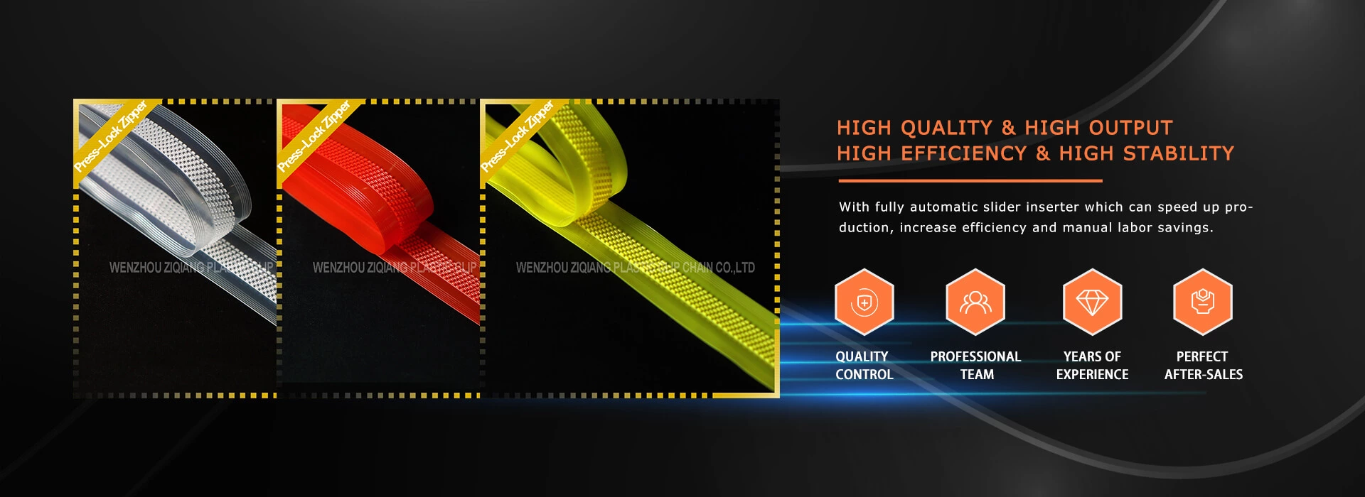 我们专业生产各种塑料拉链及相关机械。我们有几十条新的高产量塑料生产线,数千个模具。从原材料到成品,我们采用全自动机器,以实现优质、高产、高效、多元化的现代化生产标准。